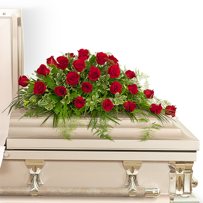 Our 24 Red Roses Casket Spray is a classic and beautiful choice for funeral flowers or a celebration of life ceremony. This casket spray features 24 beautiful red roses and a variety of premium foliage, to be laid on the top of the casket. Red roses symbolize respect, love, and courage in a sympathy design. Funeral flowers are a meaningful way to celebrate the life of the deceased while providing comfort to the friends and family left behind.