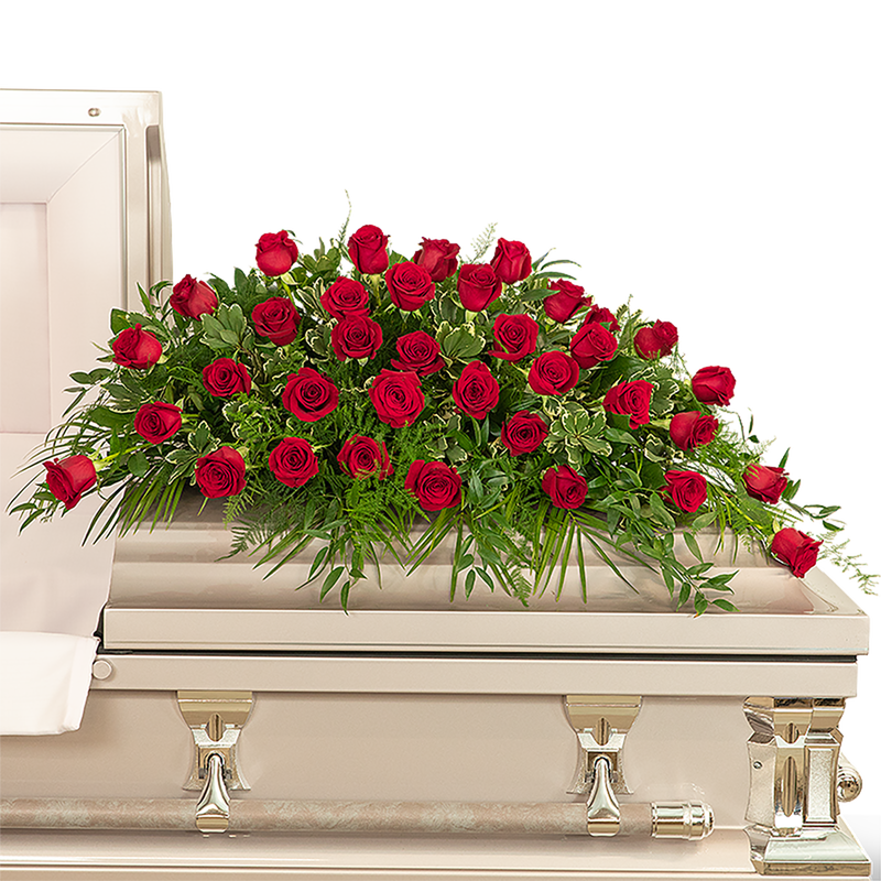 Our 36 Red Roses Casket Spray is a classic and beautiful choice for funeral flowers or a celebration of life ceremony. This stunning casket spray features 36 beautiful red roses and a variety of premium foliage, to be laid on the top of the casket. Red roses symbolize respect, love, and courage in a sympathy design. Funeral flowers are a meaningful way to celebrate the life of the deceased while providing comfort to the friends and family left behind.
