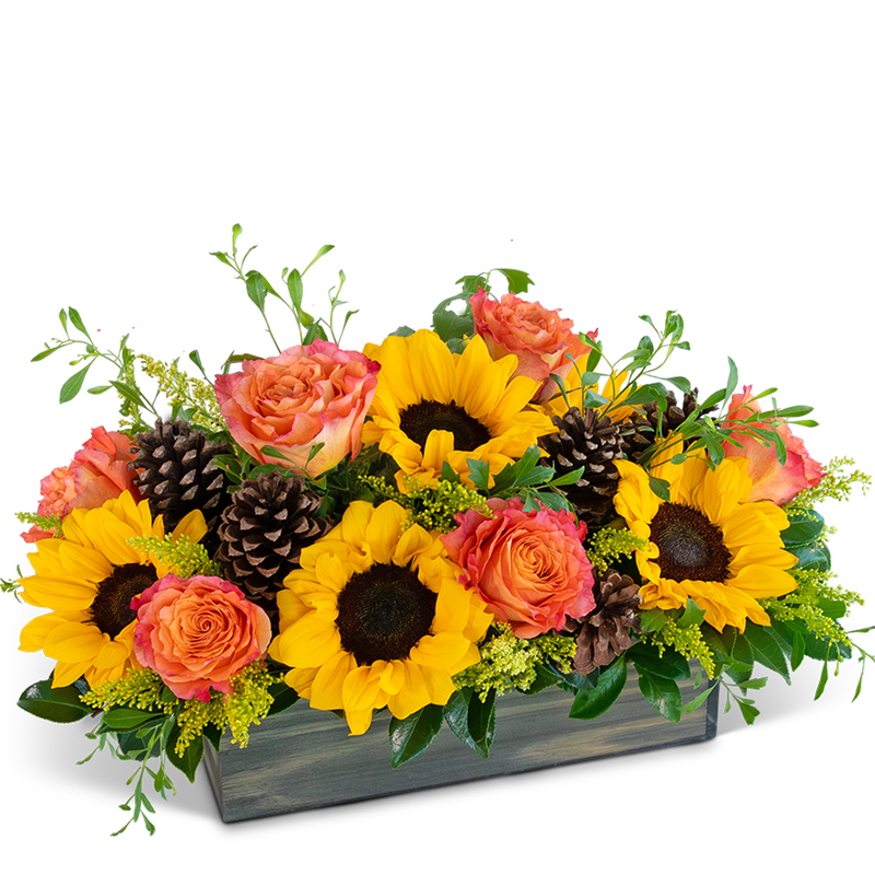 Inspired by the beauty of the harvest season, our Abundant Autumn Fields design features a captivating blend of sunflowers, roses, pine cones, and lush foliage styled in a long and low wooden cube container. This charming centerpiece infuses the warmth and rustic charm of fall into any setting, making it the perfect choice to adorn your table or send as a heartfelt gift to a loved one. Upgrade to deluxe or premium for more blooms, enhancing the beauty of this stunning arrangement.