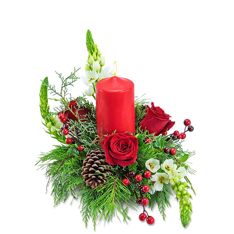 There's no place like home. That feeling of contentment is captured with this arrangement of roses, Star of Bethlehem, pinecones, berries, and ornaments with assorted evergreen and foliage surrounding a pillar candle. Adored Home is the perfect way to show family and friends how much you care.