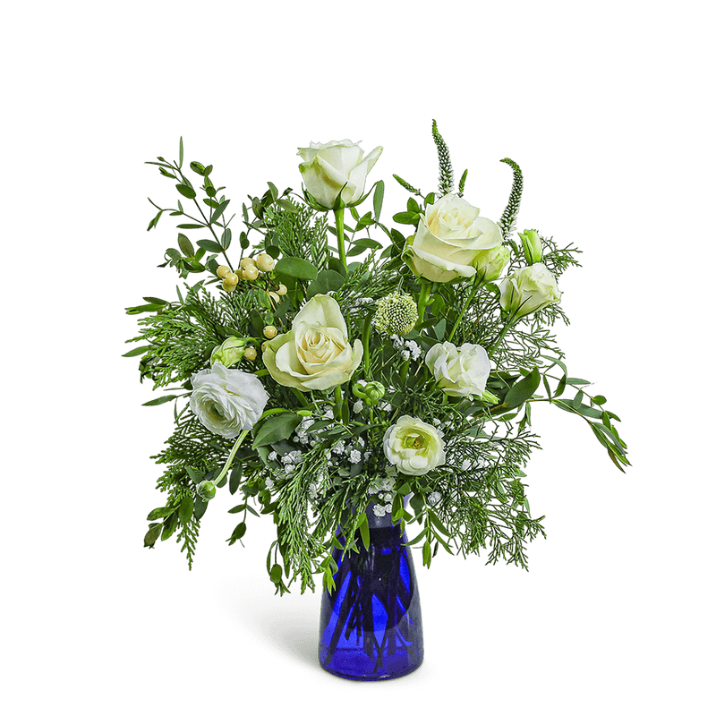 Alpine Mood is a serene winter arrangement featuring white Roses, Ranunculus, Veronica, winter berries, and premium seasonal foliage in a rich cobalt blue vase. This elegant design brings a fresh, peaceful vibe to any space. Flowers and vase may vary slightly based on availability, but the overall look will be beautifully maintained.