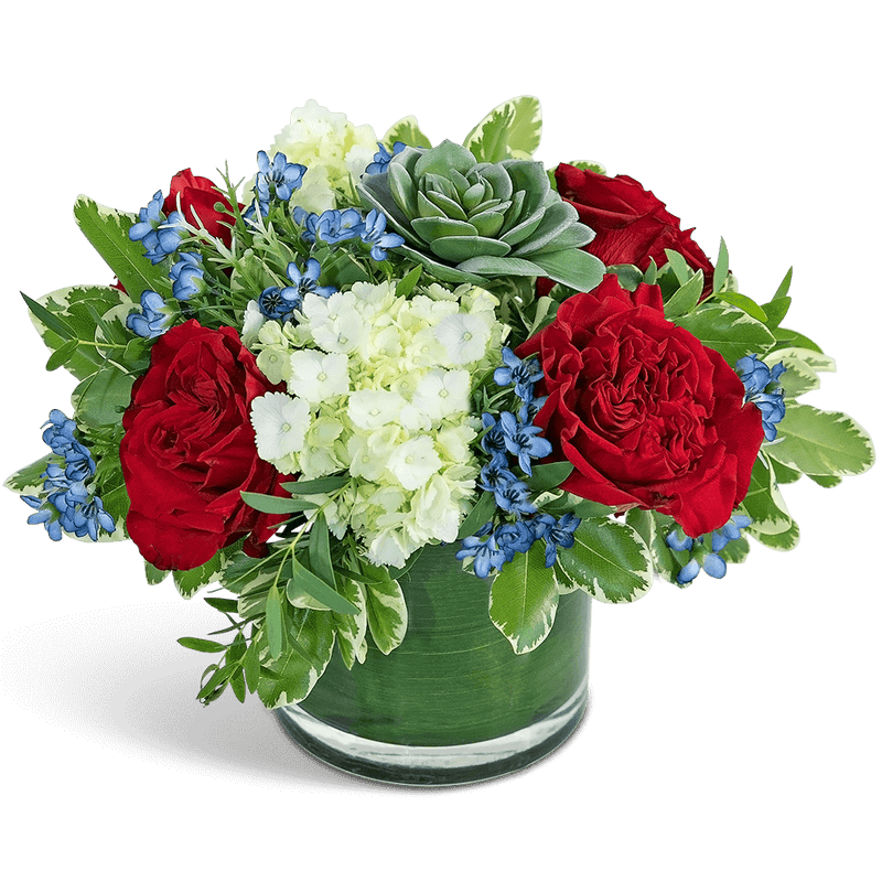 Surprise them with a hand-arranged, vase of flowers. Anthem of Peace is perfect for any patriotic event or family gathering, or even flowers for a veteran. This arrangement features roses, hydrangea, and pops of blue accent flowers and premium foliage, designed in a leaf-lined glass vase for a striking and patriotic presentation.