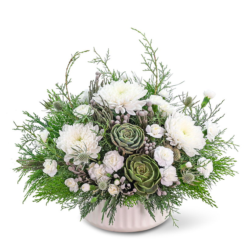 Embrace the magic of winter with the Arctic Aura flower arrangement, featuring a blend of Cremons, Carnations, Eryngium, Succulents, and premium foliage in a sleek white ceramic vase. This stunning arrangement captures the essence of the season, making it a perfect addition to holiday decor or a thoughtful gift to bring a touch of frosty elegance to any festive celebration.