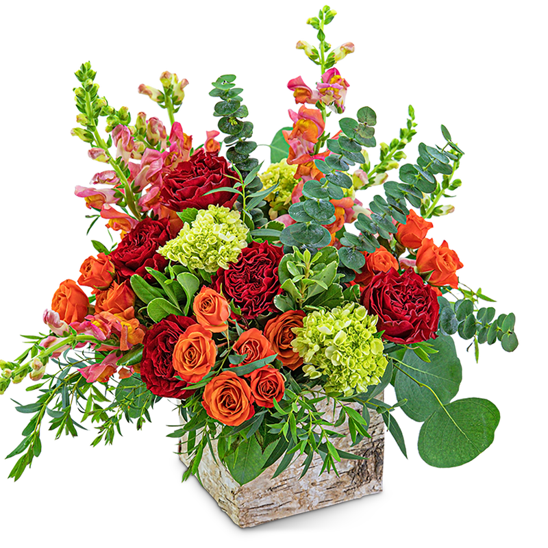 The oranges, pinks, and reds positively glow in this beautiful bouquet! Roses, snapdragons, hydrangea, eucalyptus, pittosporum, and parvifolia are arranged in a charming wooden box. Aspen Glow is the perfect design for a housewarming, birthday, or get well gift.