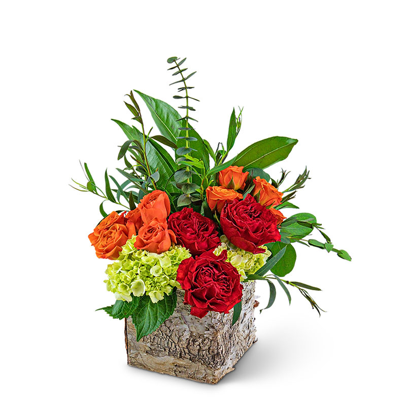 The rich reds and oranges of this bouquet will add a warm glow to any room. Aspen Sun combines roses, hydrangea, eucalyptus, and parvifolia in a charming birch box. No matter what the occasion, this is the perfect gift!