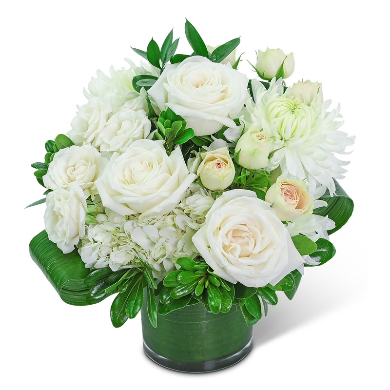 Our stunning cream and blush flowers are long-lasting and the perfect gift for any occasion. Traditional roses, contemporary mums, and playful hydrangea mix to create a stunning bouquet! Aurora Angel is bursting with blossoms and arranged in an eye-catching glass vase, accented with premium foliage. A shop favorite, this timeless beauty is perfect for any occasion!