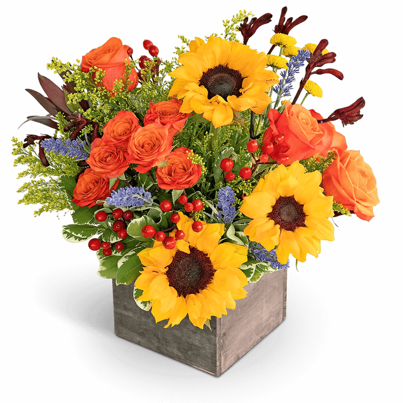 All the colors of fall are captured in Canyon Blooms. This bright arrangement features roses, sunflowers, Leucodendron, hypericum berry, and premium foliage. Whether celebrating a birthday, an anniversary, or the beauty of fall, this bouquet will add just the right touch of warmth. This burst of colorful flowers is designed by our florist in a wooden cube to create a gift that will truly shine.