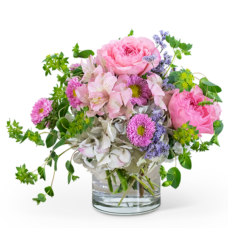 Send your love with this beautiful design, perfect for a new baby gift. Darling One features pink Myra roses, soft pastel hydrangea, Matsumoto asters, pink alstroemeria, lavender Limonium, and bupleurum for a long-lasting floral experience perfect for the new little darling in your life!