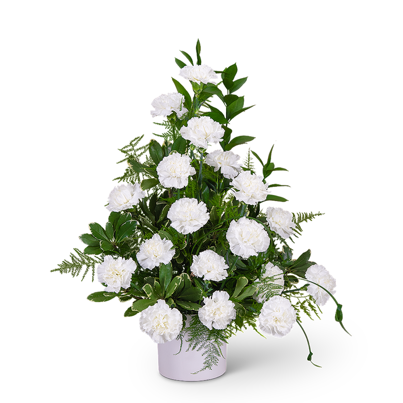 The Divinity Urn is a classic white funeral design that can be sent to the service or to a home. White flowers are a popular choice for sympathy and white carnations symbolize pure love and innocence. Divinity Urn features Carnations, Ruscus, Plumosa, and other premium foliage and can be displayed on a side table near the casket. For any and all sympathy flowers, feel free to contact our shop for ideas and variations to make your final tribute extra unique and special.