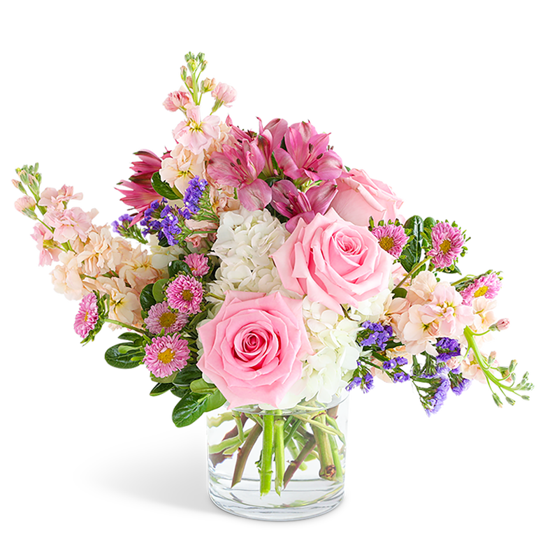 Spread love and joy with our exquisite Dreamy Cloudscape flower design. Delicate pink roses, Alstroemeria, and Hydrangea are artfully arranged in a clear glass vase, creating a beautiful and tender look that is sure to bring a smile to anyone's face. With its pop of pastel colors, this unique flower arrangement is perfect for adding a touch of soft elegance to any occasion. Our floral inventory changes with the seasons and market availability. These images are indicative of our general size & style. We can offer same-day flower delivery in most cases. If you are sending the bouquet directly to your recipient, please provide the complete address and contact information so that we can deliver the flowers directly to them.