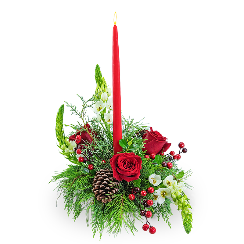 Who wouldn't love to receive this enchanting arrangement? Enchanted Home features roses, Star of Bethlehem, pinecones, berries, and ornaments with assorted evergreen and foliage surrounding a taper candle. It's sure to add a dash of cheer to any home!