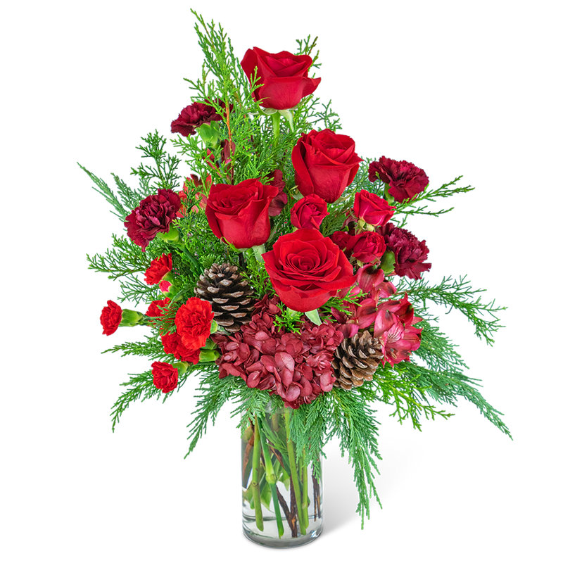 Our Enchanted Ruby Forest arrangement is a shop favorite, and it's no wonder why. This captivating design showcases the beautiful allure of hydrangea, roses, carnations, alstroemeria, evergreen foliage, and pinecones, perfectly arranged in a clear glass vase. Whether you're looking for a thoughtful gift or simply want to bring warmth and a touch of holiday magic to your space, this enchanting centerpiece creates a cozy atmosphere that will be cherished by all who experience it.