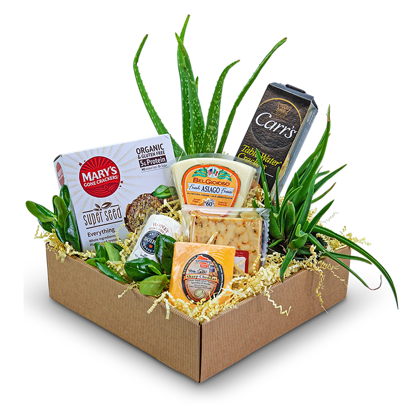 Our Entertain Me Basket is a modern twist on a classic cheese and cracker gift basket. This modern-looking box full of crackers, gourmet cheeses, and succulent plants is the perfect housewarming or get well gift. Gift baskets are a great way to celebrate many life events, including housewarming, birthdays, congratulations, get well gifts, and thank you. *The selected assortment may vary based on the season and availability.