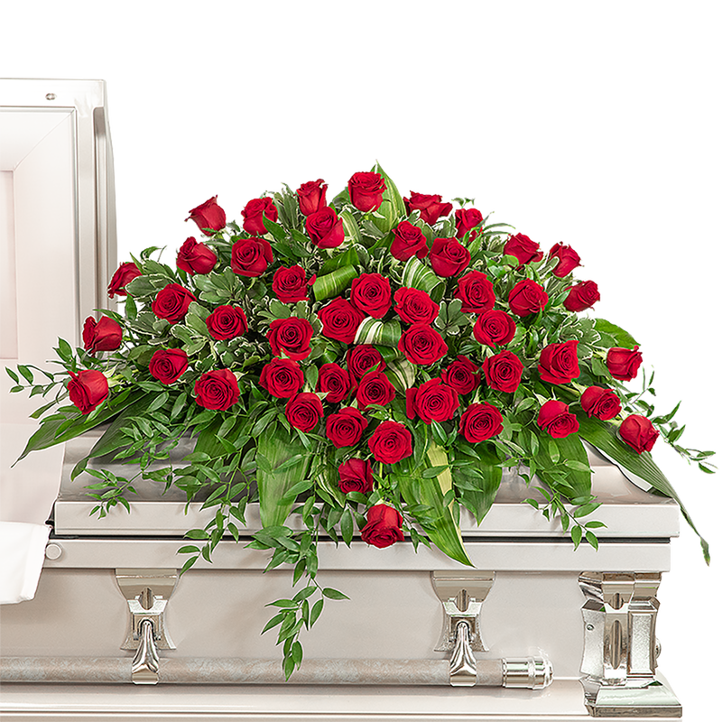 Our Everlasting Love Casket Spray is a classic and beautiful choice for funeral flowers or a celebration of life ceremony. This casket spray features beautiful red roses and a variety of premium foliage, to be laid on the top of the casket. Red roses symbolize respect, love, and courage in a sympathy design. Funeral flowers are a meaningful way to celebrate the life of the deceased while providing comfort to the friends and family left behind.