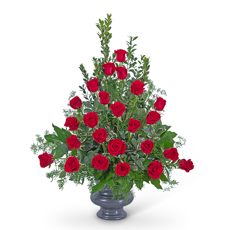 Roses are a beautiful choice for a Funeral or Celebration of Life Service. Our Everlasting Memory Urn is an elegant design that features beautiful red roses and a variety of premium foliage, to be displayed on a side table near the casket or sent directly to the home. Red roses symbolize respect, love, and courage in a sympathy design. Funeral flowers are a meaningful way to celebrate the life of the deceased while providing comfort to the friends and family left behind.