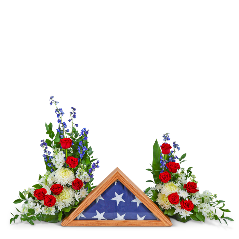 Our Final Salute Memorial Tribute is a popular choice for the funeral or celebration of life ceremony for the patriot you are honoring. Sympathy flowers for a veteran are beautifully shown in red, white, and blue funeral flowers. This patriotic theme is beautifully accomplished with two individual designs featuring a combination of Roses, Stock, Delphinium, Mums, Aspidistra, and other premium foliage. They come together to make a truly honorable tribute for your loved one who fought for our freedom. The flag is not included but is featured to show the unique personalization of adding a family keepsake to the design.
