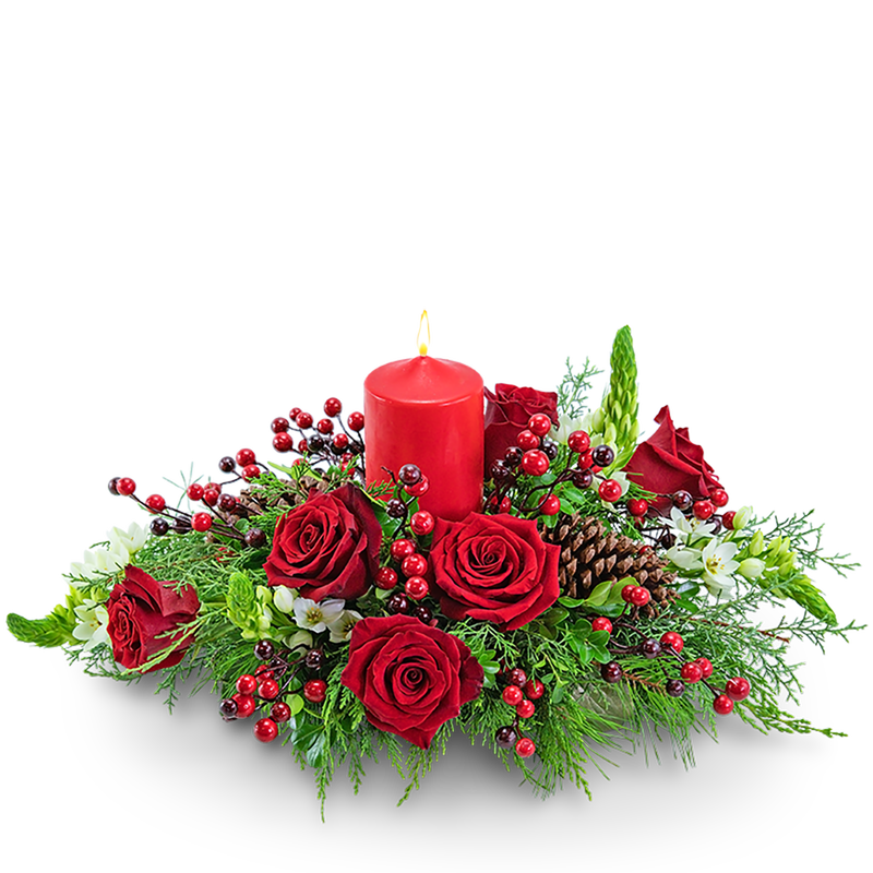 Nothing is more cozy than sitting by the fireside on a cold winter day. Fireside at Home captures that feeling with roses, Star of Bethlehem, pinecones, berries, and assorted evergreen surrounding a pillar candle. This arrangement will add a festive glow to any space.