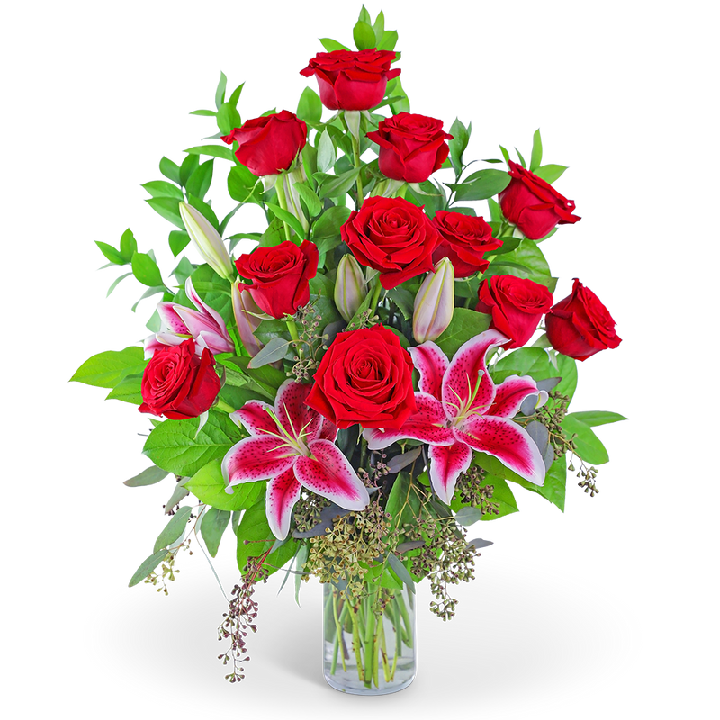 Fly Me to the Moon is a beautiful design, perfect for showing your affection to that special someone. It features red roses, stargazer lilies, and premium foliage, all designed in a clear glass vase that will show well on a dining room table, desk, or end table. It is the perfect gift for Valentine's Day, a special Anniversary present, or to just send a reminder of your love.