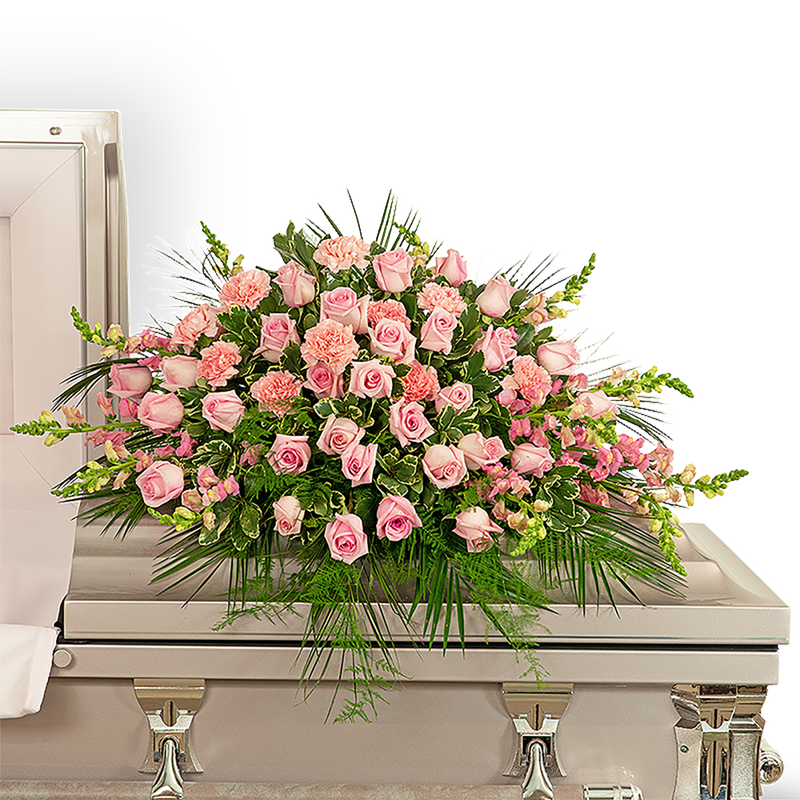 Pink carnations symbolize thoughts of remembrance, while pink roses are a sign of appreciation and grace. We bring together these beautiful pink flowers in a stunning design we call our Forever Adored Casket Spray. It features delicate pink roses, carnations, snapdragons, Emerald, Plumosa, and premium foliage. The casket spray is typically provided by the spouse or immediate family as a heartfelt memorial from the family and is designed to sit on the lid of the casket for a funeral service or memorial.
