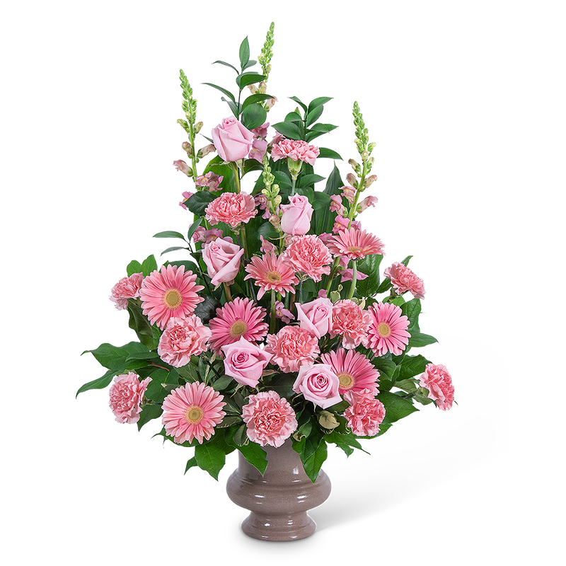 Pink carnations symbolize thoughts of remembrance, while pink roses are a sign of appreciation and grace. We bring together these beautiful pink flowers in a stunning design we call our Forever Adored Urn. It features delicate pink roses, carnations, snapdragons, Gerbera, Aspidistra, and premium foliage. Forever Adored Urn is the perfect sympathy design to send to a funeral or a grieving family to let them know their loved one will be forever adored and remembered.