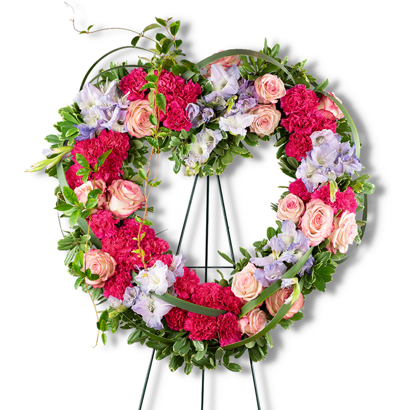 Our Forever Rejoicing Heart is designed to represent a celebration of your loved one's life that was well lived. The lavender gladiolus, pink roses, bright pink carnations, and premium foliage come together to create a stunning and joyous standing heart design. Pink roses often represent love, grace, appreciation, and kindness. Pink carnations stand for remembrance. Funeral flowers bring healing to family and friends and are the perfect way to honor and celebrate an amazing life.
