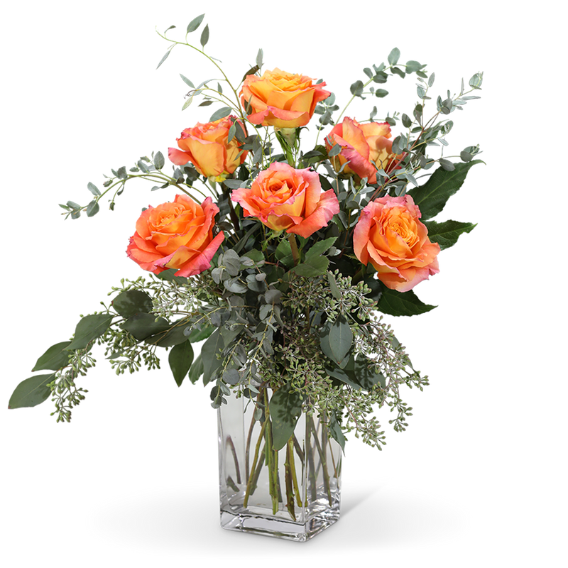 Free Spirit roses know no bounds! They are a long-lasting treat for the senses. Their unique tones of color range from orange, peach, persimmon, and pink, often all in one bloom! Their scent will fill and brighten any room. This design features half a dozen Free Spirit Roses, accented with complementing green foliage. This design is perfect for any occasion!