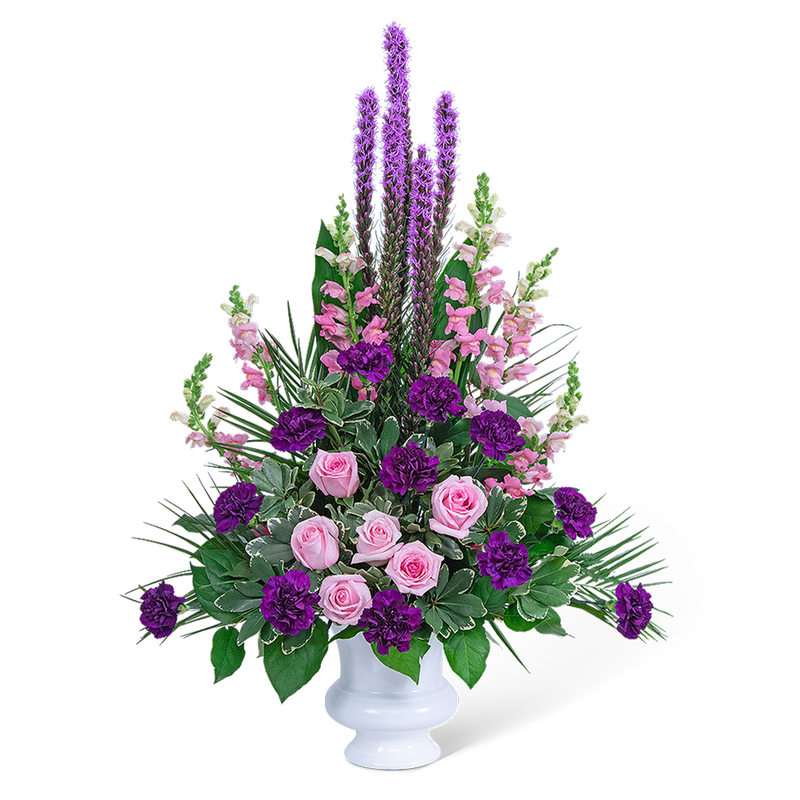 Our Garden of Life Urn is a beautiful design of purple and pink sympathy flowers. We combine roses, Carnations, Liatris, Snapdragons, and other premium foliage to make a stunning tribute for a woman who was dearly cherished. The Garden of Life Urn is the perfect sympathy design to send to a funeral or a grieving family to let them know their loved one will be forever loved and remembered.
