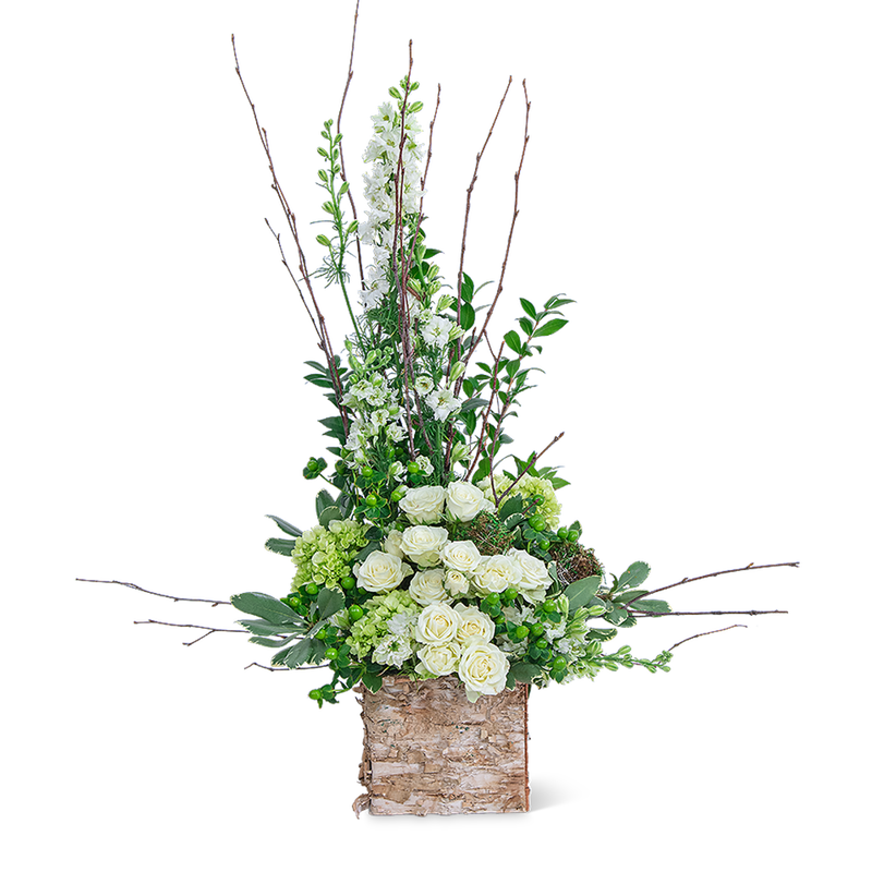 The Grace design is stunning, with white spray roses, mini green hydrangea, Larkspur, Hypericum Berry, Myrtle, and Birch Branches. This versatile design can be sent as a gift for birthday, anniversary, or even as flowers for sympathy.