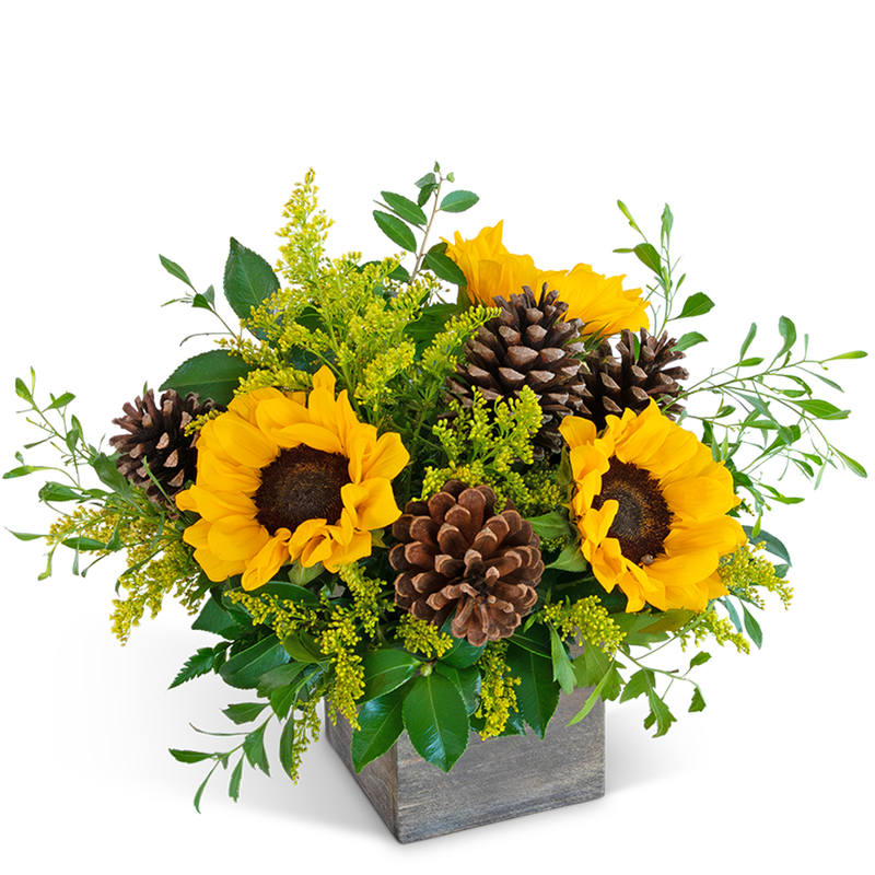 Capture the essence of autumn with our Harvest Sunburst Beauty arrangement, featuring sunflowers, pine cones, and premium foliage in a rustic wooden cube container. This blend of vibrant blooms and natural elements captures the essence of the season. Upgrade to deluxe or premium for additional blooms added in, enhancing the beauty and fullness of this stunning floral arrangement.