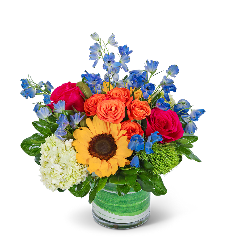Experience the vibrance of our Havana Heat flower design, an explosion of bright, bold colors that will infuse any space with energy and joy. This exuberant arrangement showcases a kaleidoscope of hues from the rainbow, featuring a mix of sunflowers, roses, hydrangeas, delphiniums, bells of Ireland, green trick dianthus, and lush foliage. Perfect for birthdays, anniversaries, or any occasion that calls for a burst of joy, the Havana Heat flower design is a show-stopping gift that will leave a lasting impression.