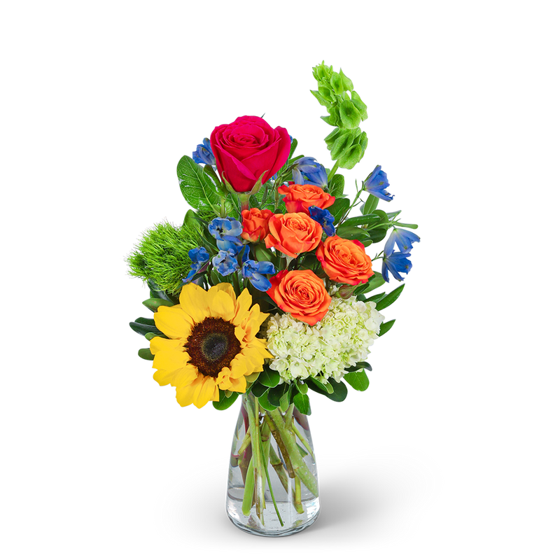 Experience the vibrant rhythm of the Havana Vibe flower design, an explosion of bright, bold colors that will infuse any space with energy and joy. This bright flower arrangement showcases a kaleidoscope of hues from the rainbow, featuring a mix of sunflowers, roses, hydrangeas, delphiniums, bells of Ireland, green trick dianthus, and lush foliage. Perfect for birthdays, anniversaries, or any occasion that calls for a burst of joy, the Havana Vibe flower design is a show-stopping gift that will leave a lasting impression.