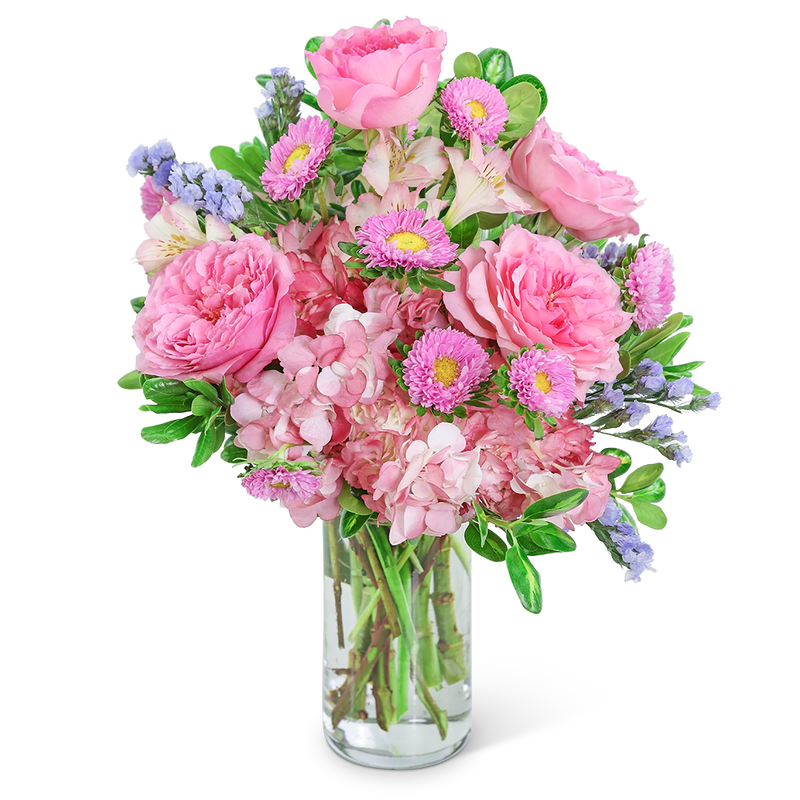 Send your love with this beautiful design, perfect for a birthday, new baby, or romantic gift. Head in the Clouds features pink roses, Alstroemeria, and Hydrangea designed in a clear vase for a delicate look that will make anyone smile. This unique flower design adds the perfect extra pop of pastel color! We can offer same-day flower delivery in most cases. If you are sending the bouquet directly to your recipient, please provide the complete address and contact information so that we can deliver the flowers directly to them.