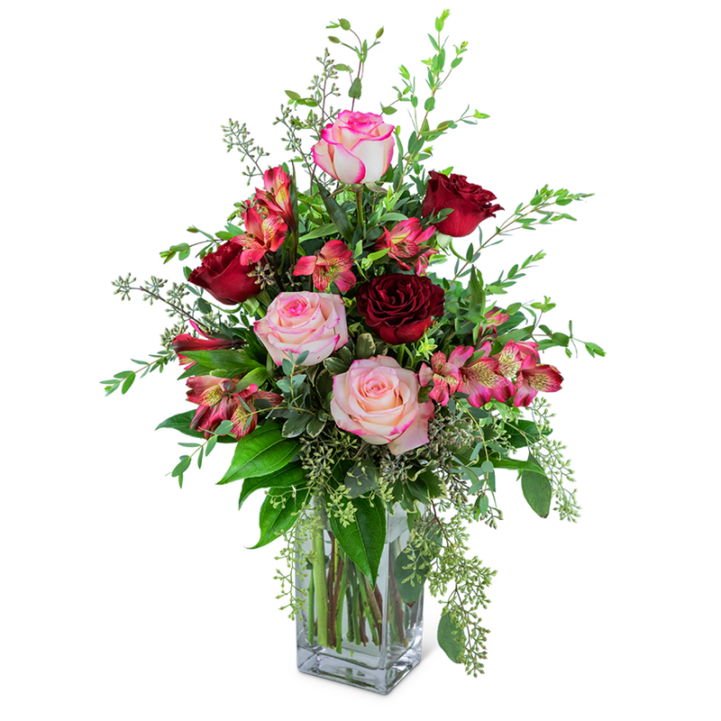 Send your heartfelt emotions to a loved one with this stunning arrangement. Roses and alstroemeria, surrounded by a variety of premium foliage including seeded eucalyptus and displayed in a tall clear vase. Heart and Soul is the perfect piece for an entry or dining table.
