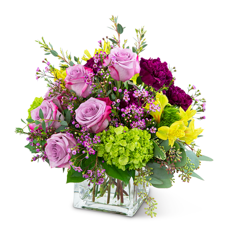 Are you wanting to send a sweet sentiment or gift? Our Heart of Gold design features long-lasting Alstroemeria, purple carnations and roses, hydrangea, premium foliage, and wax flower accents. Heart of Gold is a lovely way to send your love and appreciation! It will be the perfect complement to a home or office and will look stunning on a coffee table or desk.