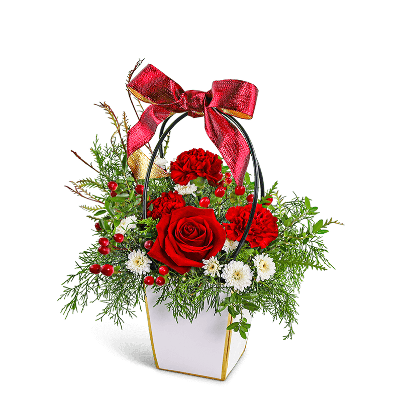 Holly Hugs Tote is a festive holiday arrangement featuring Roses, Carnations, Button Mums, and Christmas foliage, all tied together with a shimmering ribbon accent. Designed in a sleek tote-style container, it's the perfect flower delivery to spread seasonal cheer.