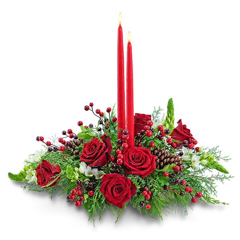 Oh, there's no place like home for the holidays! This delightful centerpiece features roses, Star of Bethlehem, pinecones, berries, and assorted evergreen surrounding 2 red taper candles. Home for the Holidays will add a festive glow to any table.