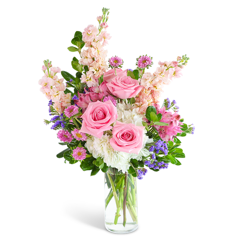 Spread love and joy with our exquisite Honey Bunches of Love Flower Design. Delicate pink roses, Alstroemeria, and Hydrangea are artfully arranged in a clear glass vase, creating a beautiful and tender look that is sure to bring a smile to anyone's face. With its pop of pastel colors, this unique flower arrangement is perfect for adding a touch of soft elegance to any occasion. Our floral inventory changes with the seasons and market availability. These images are indicative of our general size & style. We can offer same-day flower delivery in most cases. If you are sending the bouquet directly to your recipient, please provide the complete address and contact information so that we can deliver the flowers directly to them.