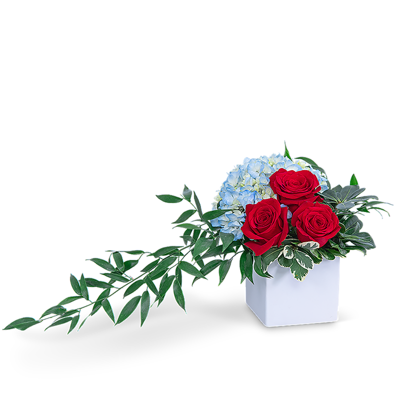 Honorable is a popular choice for flowers for Memorial Day or Independence Day and is beautifully shown in red, white, and blue flowers. This patriotic theme is accomplished with Roses, Hydrangea, and other premium foliage in a classic white ceramic container. Honorable would also be a beautiful tribute to send for a military funeral.