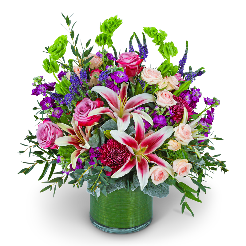 The Hyde Park flower design features a captivating blend of deep purples, pinks, and greens, exuding a sense of romance and elegance. This stunning arrangement includes roses, stock, lilies, cremons, and premium foliage artistically arranged in a leaf-wrapped cylinder vase, making it a luxurious and sophisticated centerpiece that will add a touch of opulence to any space. Embrace the beauty of nature with Hyde Park, a harmonious combination of rich hues and exquisite blooms.