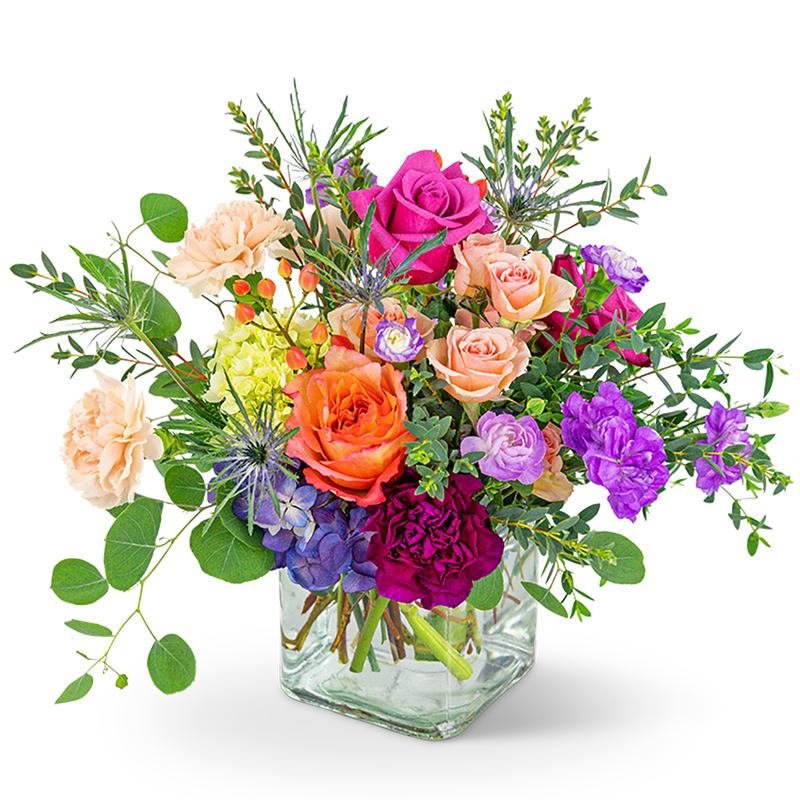 Kaleidoscope Dream is the perfect birthday or anniversary gift. Let us help make their day with this special flower delivery! The rich tones of this arrangement will add a pop of color to any space. It features Hydrangea, Roses, Carnations, and other premium foliage.