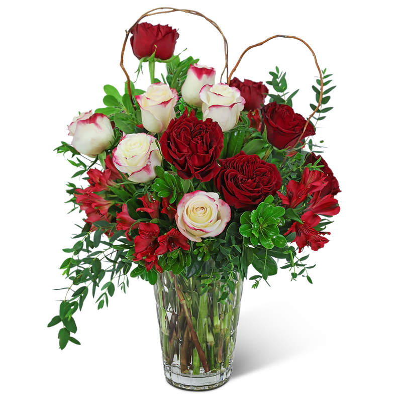 This gorgeous design is hand-arranged by our professional floral designers and delivered in a lovely vase. The rich, romantic colors of Language of Romance are sure to melt the heart of your loved one. Beautiful ruffly roses, alstroemeria, and premium foliage are artfully arranged with a natural heart accent nestled in. Flower delivery has never been easier or more appreciated. Whether you are looking for a birthday, anniversary, or valentines day gift, we have flowers that are sure to fit the occasion!