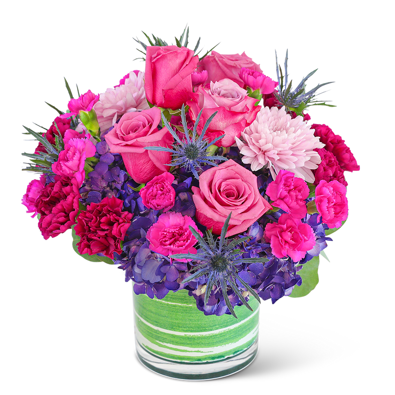 Delight in the rich purple tones of one of our floral favorites, London Luxe. A chic, leaf-lined vase with hydrangea, roses, carnations, and premium foliage makes up this luxe floral design. This vibrant flower arrangement will brighten anyone's day and add a pop of color to any space.