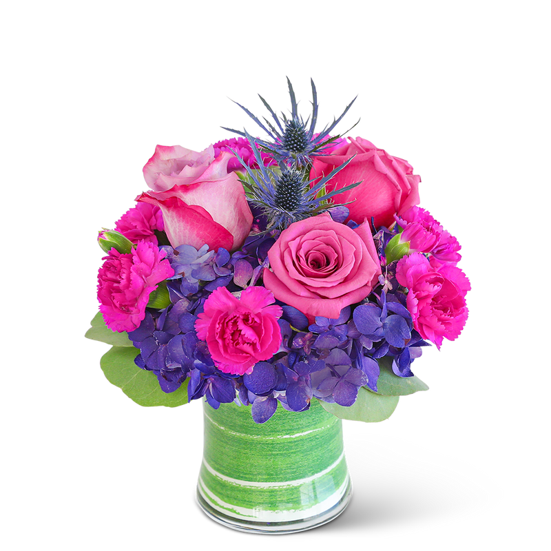 Delight in the rich purple tones of one of our floral favorites, London Posh. A chic, leaf-lined vase with hydrangea, roses, carnations, and premium foliage makes up this gorgeous floral design. This vibrant flower arrangement will brighten anyone's day and add a pop of color to any space. It would make a perfect Anniversary or Birthday gift for that special someone.