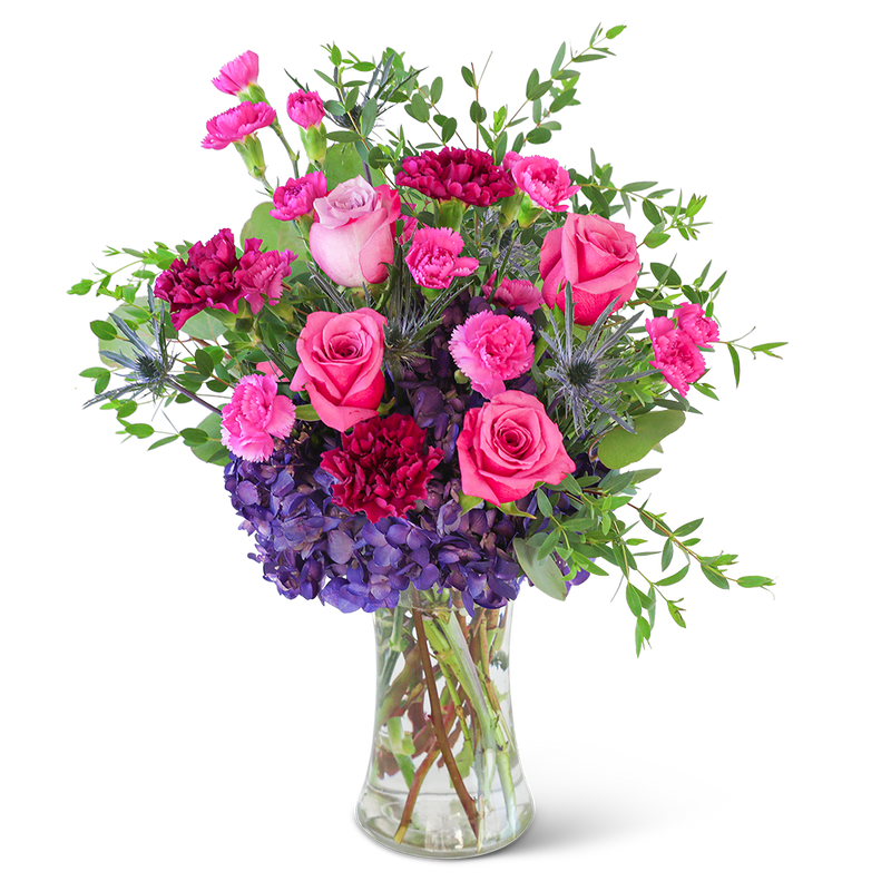 Delight in the rich purple tones of one of our floral favorites, Love in London. A tall, chic vase with hydrangea, roses, carnations, and premium foliage makes up this beautiful floral design. This vibrant flower arrangement will brighten anyone's day and add a pop of color to any space. It would make a perfect Anniversary or Birthday gift for that special someone.