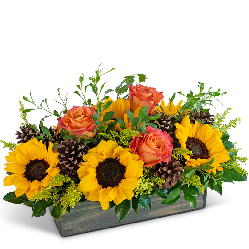 Inspired by the beauty of the harvest season, our Luminous Autumn Fields design features a captivating blend of sunflowers, roses, pine cones, and lush foliage styled in a long and low wooden cube container. This charming centerpiece infuses the warmth and rustic charm of fall into any setting, making it the perfect choice to adorn your table or send as a heartfelt gift to a loved one. Upgrade to deluxe or premium for more blooms, enhancing the beauty of this stunning arrangement.