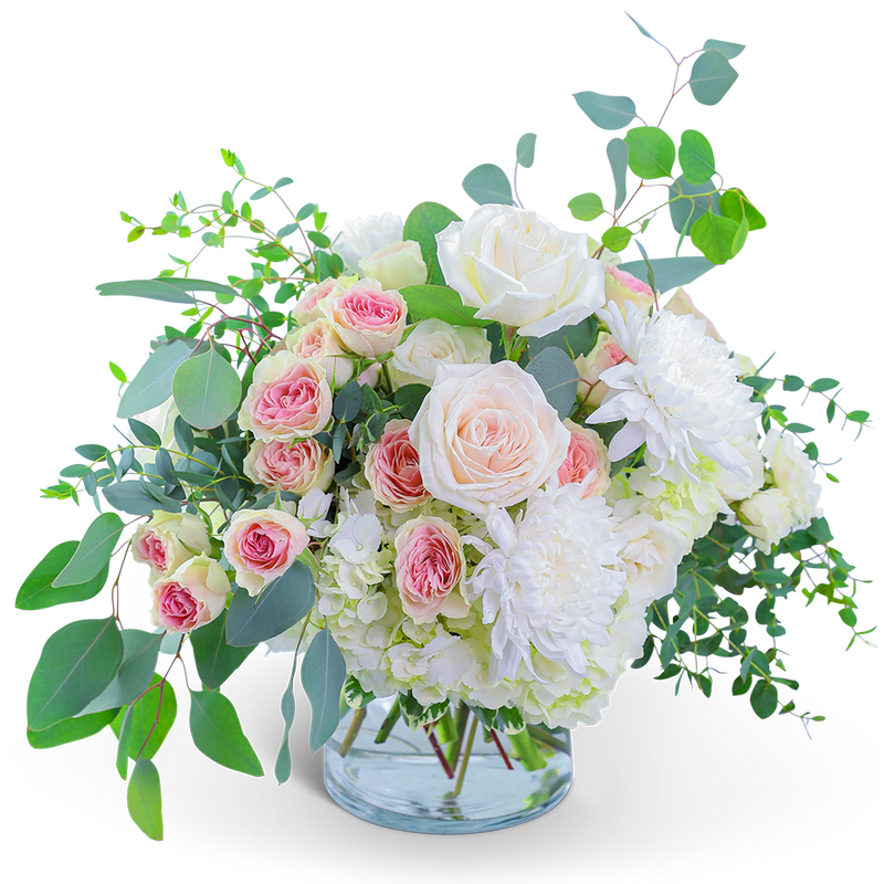 Awaken the senses as you walk into your own romantic floral fantasy! Traditional roses, contemporary mums, and playful hydrangea mix to create a stunning bouquet! Lush Blush Suede is bursting with blossoms and arranged in an eye-catching clear glass vase, accented with premium foliage. A shop favorite, this timeless beauty is perfect for any occasion!