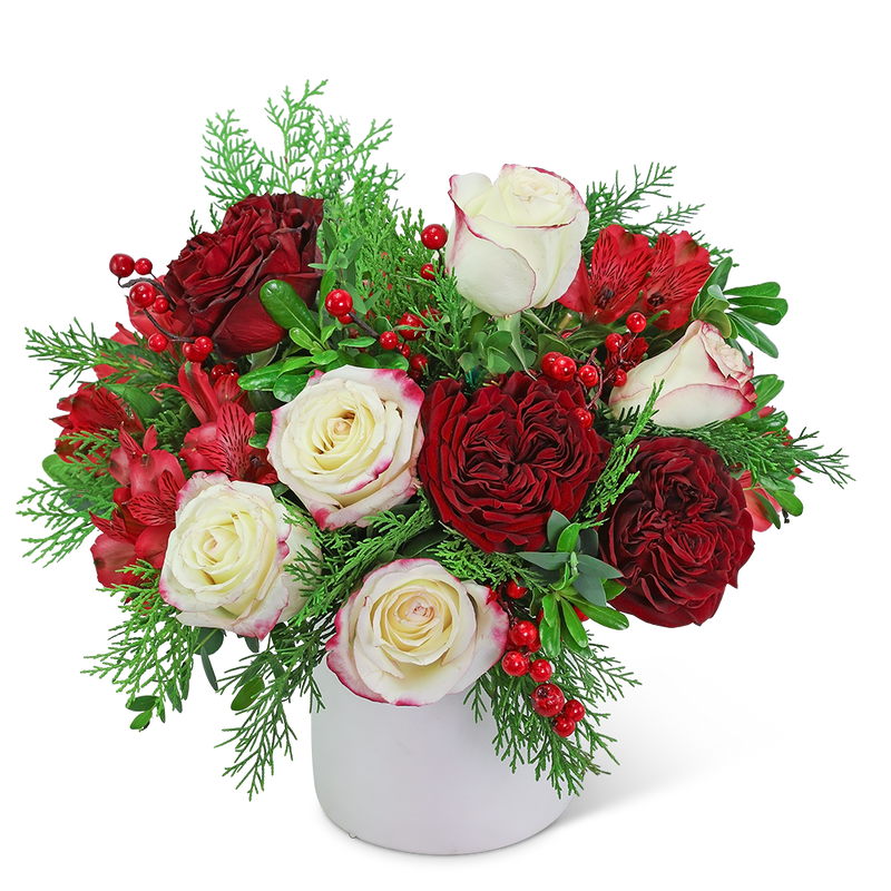 The rich, romantic colors of Luxe Berry Wonderland are sure to melt the heart of your loved one. Beautiful ruffly roses, alstroemeria, and other premium flowers and winter foliage are artfully arranged in an on-trend white vase. Flower delivery has never been easier or more appreciated. Whether you are looking for a birthday, anniversary, or valentines day gift, we have flowers that are sure to fit the occasion!