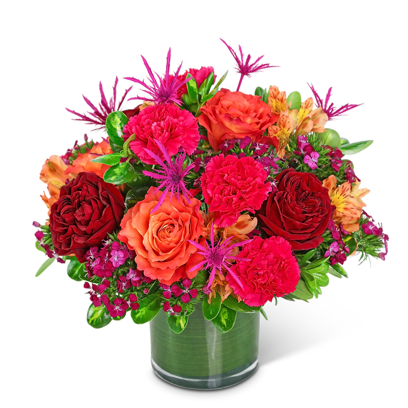 Add bold color to your life with our Mango Pacifica design. Our hand-arranged floral design is the perfect way to show someone special how much you care. It features gorgeous reds, pinks, and oranges in a combination of Roses, Carnations, Alstroemeria, Dianthus, and premium foliage. This sweet, colorful arrangement is the perfect statement piece for a coffee table or desk.