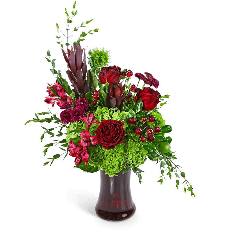 Merlot Romance is a stunning mix of Roses, Mums, Alstroemeria, Hydrangea, Safari Sunset, Hypericum Berries, and lush foliage. Arranged in a deep merlot vase, this design is perfect for adding richness and charm to any occasion. Our expert floral designer may make thoughtful adjustments based on availability while preserving the overall look and feel.