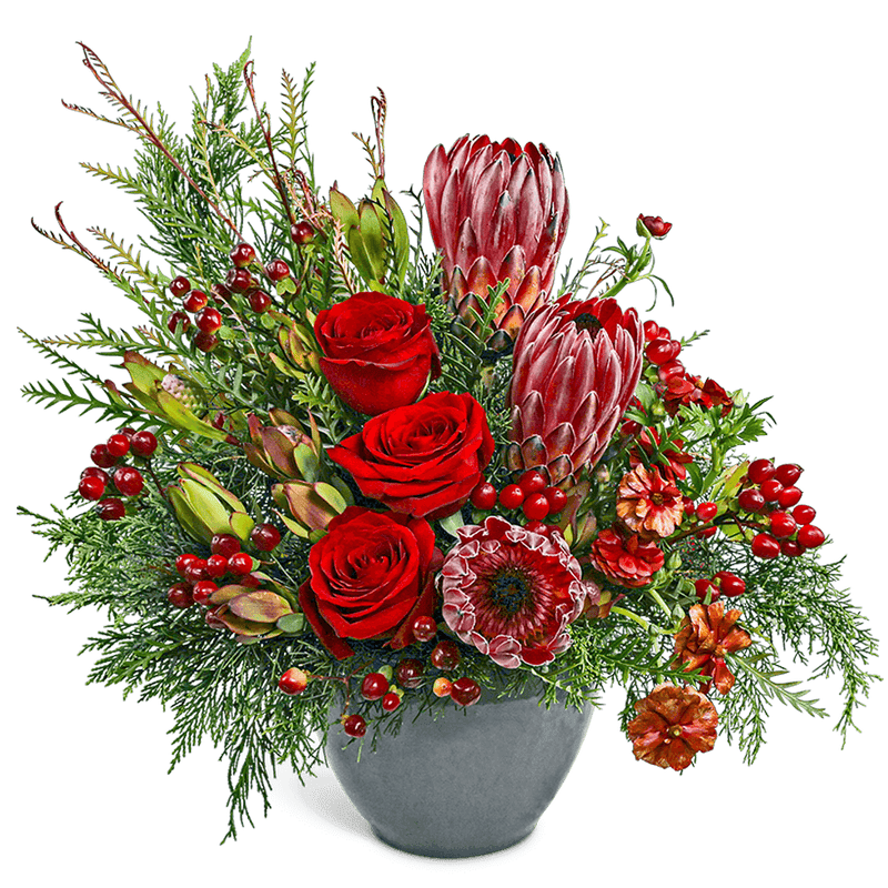 Midnight Crimson is a dramatic and luxurious arrangement featuring bold red Roses, Protea, and festive seasonal accents. Designed in a charcoal vase and bursting with texture and depth, it's perfect for holiday flower delivery or striking winter centerpieces. Our floral designer may make thoughtful substitutions while maintaining the overall look of the arrangement.
